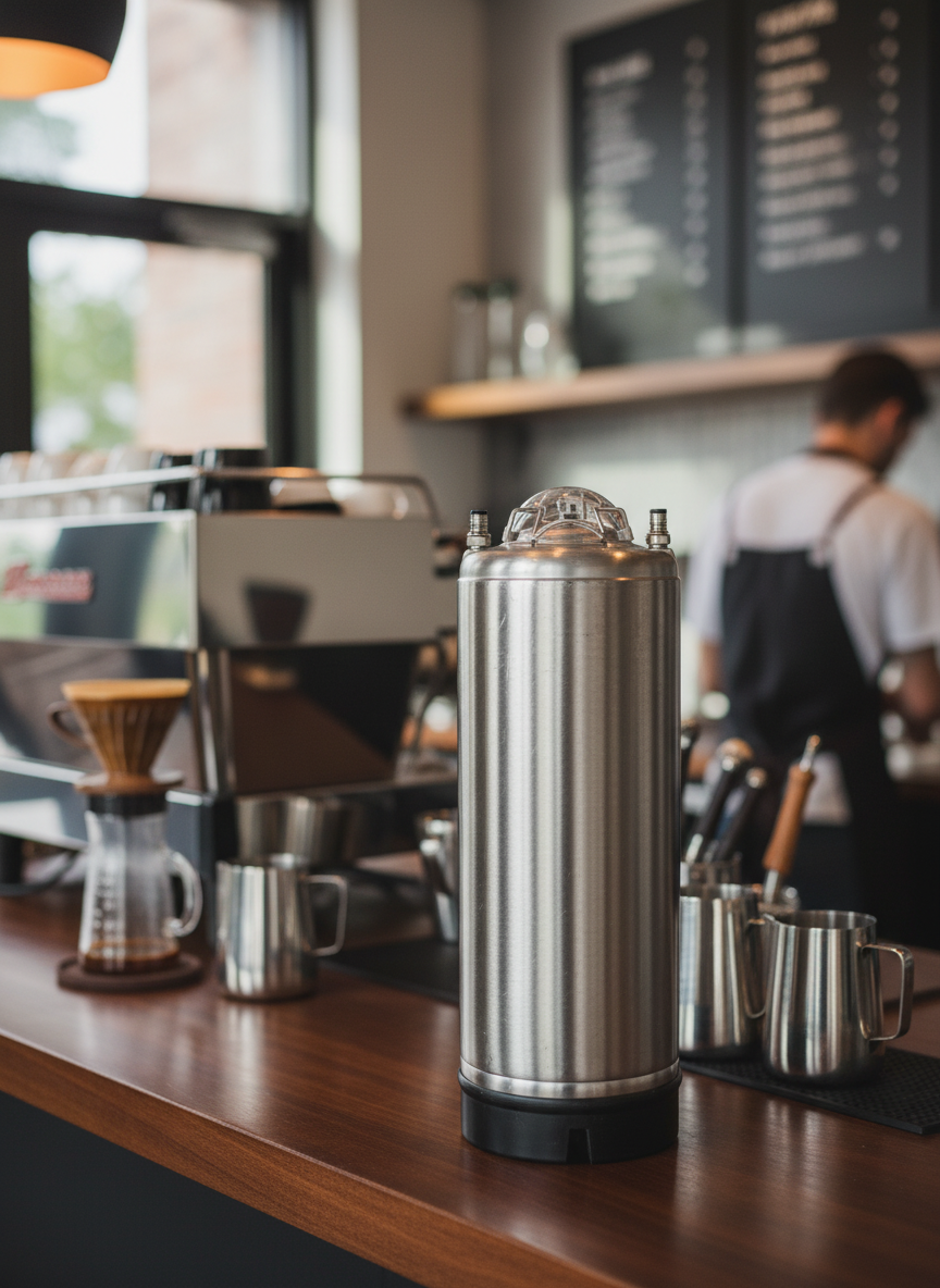 Crysalli 5-Gallon Premix Tank with Ball Lock Coupler Style, a perfect choice for your coffee shop.