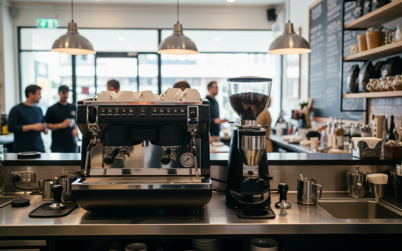 Nuova Simonelli 2 Group Espresso maker and the Hey Cafe Buddy Coffee mill, a perfect choice for your coffee shop.